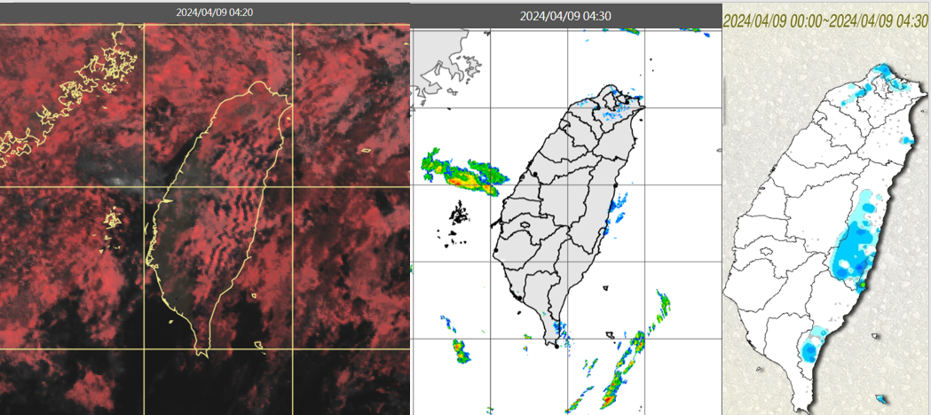 圖:今(9日)晨4:20真實色雲圖顯示,台灣上空有鬆散的雲層通過(左圖);4:30雷達回波合成圖顯示,雲層伴隨零星降水回波(中圖);4:30累積雨量圖顯示,北部、東半部有局部降雨(右圖)。 |