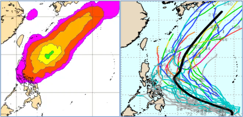 最新(19日20時)歐洲(ECMWF)系集模式(左圖)及美國(GEFS)系集模式(右圖)皆模擬,未來一週至10天,在菲律賓東方海面有「熱帶擾動」醞釀,發展緩慢;其未來動向,先朝西北逐漸接近,再向東北大迴轉遠離,兩國模擬皆有很大的「不確定性」,莫急下定論、應持續觀察。
