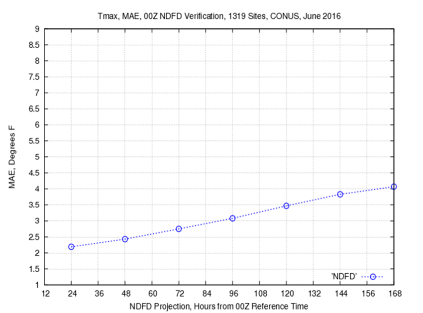 圖:美國全國1319個點預報,2016年6月分高溫的絕對平均誤差(MAE)校驗顯示,第2天已達華氏2.2度(約攝氏1.3度),且隨時間擴大,第5天已達華氏3.5度(近攝氏2度) ,第6、7天絕對平均誤差還繼續擴大。顯示出今日高溫預報的極限。 |