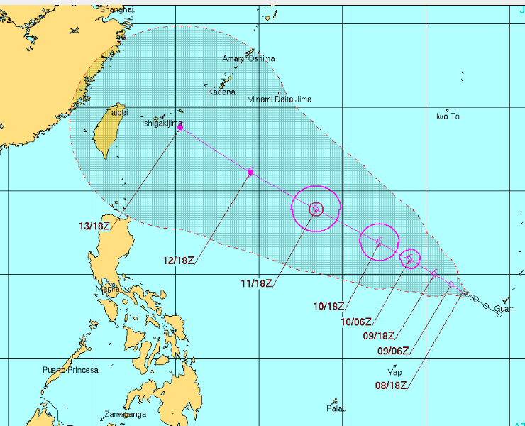 歐洲中期預報中心(ECMWF)最近兩天以及部分國家的電腦模擬顯示,未來一週西北太平洋將有2至3個颱風生成。目前在關島西方海面的熱帶擾動可能在週六、日(10、11日)最先發展,形成後將受太平洋高壓的導引,向西北西進行,會多麼靠近台灣再逐漸北轉?這就要持續觀察了!由於科技的極限,電腦只有透過不斷的模擬,來逐漸減小預報誤差,但距今6、7天的預報,誤差超過6百甚至1千公里以上者是很常見的。所以這個颱風對秋節天氣的影響,現在來論斷,確實「言之過早」,但應持續注意新資料的變化。目前在東亞各國的預報作業中心之中,以美軍聯合警報中心(JTWC)在今(9)日2時最先發布相關的預報(圖),確定性的路徑預報,在5天後將進行至宮古、石垣島附近。但預報不確定的範圍(陰影區),颱風將來行進至琉球或者台灣一帶,都是屬於無法確定的可能路徑,透露岀的訊息與電腦模擬結果是相類似的,就是其中存在很大的變數。因此,不宜過早去論斷它確切的路徑及影響程度。