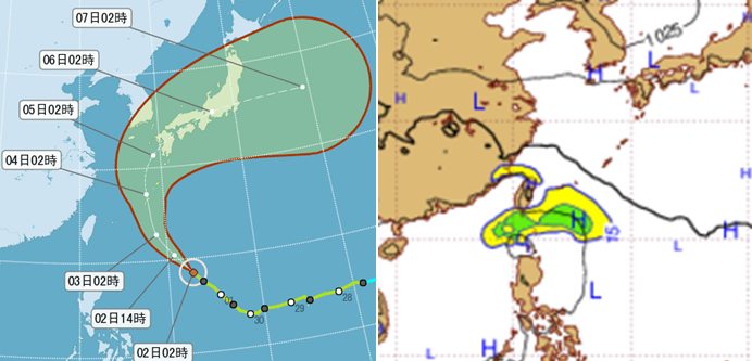 左圖:中央氣象局2日2時「路徑潛勢預測圖」顯示,中度颱風芙蓉向西北快速進行。預計通過琉球後,繼續轉撲向九州、四國。赴日要特別注意其動態。 右圖:歐洲中期預報中心(ECMWF)1日20時電腦模擬顯示,5日前後,在菲律賓東方海面可能有颱風形成,6日進入巴士海峽,之後繼續向西進入南海。以目前的資料要研判這個熱帶系統對台灣的影響程度,是很不確定的,需持續觀察。 |
