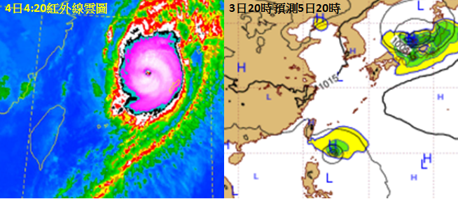 左圖:今(4日)晨4時左右的紅外線雲圖顯示,其位置已在琉球西北方海面,其雲型結構依舊紮實。 左圖:歐洲中期預報中心(ECMWF) 3日20時模擬顯示,5日20時熱帶系統在呂宋島東北方海面,6日將通過巴士海峽(距離台灣很近)朝廣東海面前進。由於其發展的時間不長,是否能跨過被定義的「輕颱」標準?很值得觀察! |
