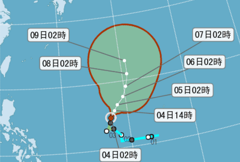 圖:中央氣象局4日2時潛勢預測圖顯示,由於導引氣流微弱,「米雷」前2天向北北東緩慢移動,但逐漸會受到西風帶的影響而慢慢加速,並增加向東的分量。