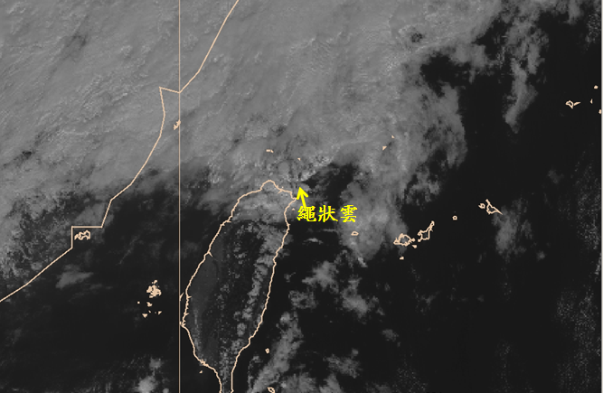 圖:8日11時可見光衛星雲圖顯示,繩狀雲(rope line)的尾端正好抵達基隆,代表該區有強的水平風切造成氣流旋轉,而輻合作用則使大氣垂直伸展,使轉速加快,提供水龍捲(Waterspout)發展的條件。 |