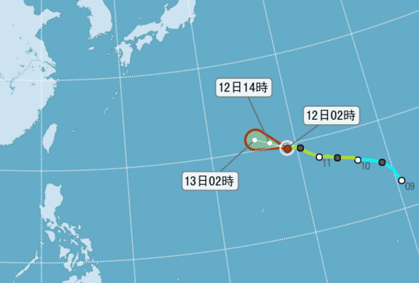 圖:中央氣象局12日2時「路徑潛勢預測圖」顯示,「馬鞍」未來行經的環境,垂直風切愈來愈大,再加上它的強度一直僅是「輕颱」的最下限,隨時都可能減弱成熱帶性低氣壓。所以只預報24小時的路徑。 |