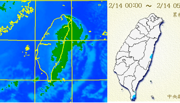 圖:今(14日)晨5時紅外線衛星雲圖(左圖)顯示,西半部晴朗、東半部雲多,是迎風面地形抬升所造成,雲層並不是很深厚。5時的日累積雨量圖(右圖)顯示,東半部有降雨,很零星、也很短暫。 |