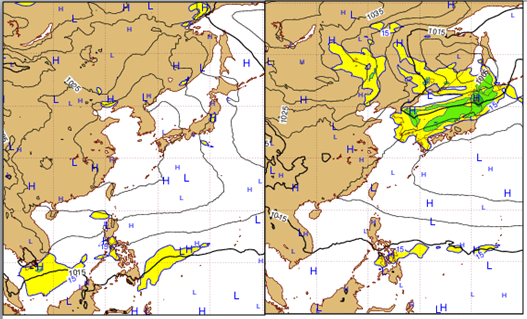 左圖:歐洲中期預報中心(ECMWF)14日20時地面分析圖顯示,極地大陸冷氣團已移至太平洋上,受海洋調節,已逐漸改變其原來乾冷之特性,故稱之「大陸變性氣團」。 右圖:歐洲中期預報中心(ECMWF)16日20時地面預測圖顯示,「大陸變性氣團」持續東移變性,低層大氣增暖、增濕,氣溫續升,台灣受高壓西南側,偏東至東南風影響,故稱之「高壓迴流」,背風面西半部穩定、迎風面東半部降雨機率略增。 |