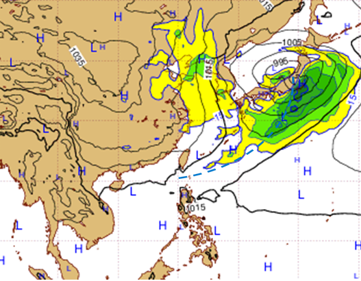 最新(16日20時)歐洲中期預報中心(ECMWF)模式的模擬顯示,對北台灣而言,明(18)日之後的天氣變化,冷暖交替頻仍,週期很短。明日至週(19)日清晨,有一小股東北風南下,北台灣雲量增多、白天轉涼,夜間低溫並未下降;迎風面有一些局部短暫雨的機率。週日上午起至下週一(20日)轉東南風,氣溫大幅回升,天氣溫暖微熱,高溫約可升至26至28度。下週二(21日)另一小股東北風南下,北台灣雲量增多、再轉涼;迎風面有一些局部短暫雨的機率。下週三(22日)轉東南至偏南風,氣溫又大幅回升,天氣溫暖微熱,但水氣增多、容易起霧,也可能有局部零星的降雨發生。下週四(23日)、五(24日)鋒面及源自蒙古的「極地大陸冷氣團」快速南下(圖),強度相當強,氣溫驟降又有明顯降雨,天氣變化很大,要注意!