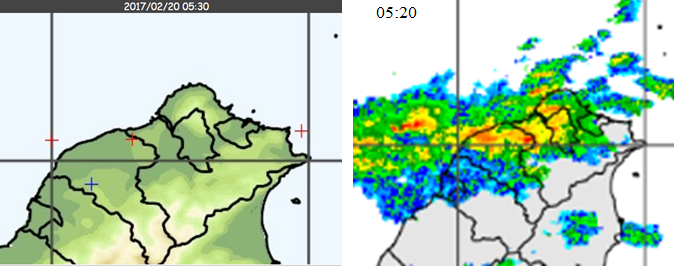 圖:20日5:30落雷偵測系統顯示(左圖),台北、桃園一帶有幾顆雷擊被偵測到。5:20雷達回波合成圖(右圖)台北、桃園一帶的回波較強,有小範圍的雷雨胞在其中消消長長。 |