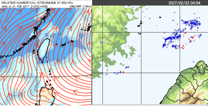 圖:22日5時氣象局細網格模式(WRF 15公里)模擬顯示(左圖),台灣北部海面、台灣海峽一帶低層(850百帕)盛行南風至西南風,有暖、濕(藍色)空氣匯集,大氣不穩定。右圖顯示22日4:54時觀測1小時落雷總數將近4百顆 (紅色為最近10分鐘之落雷),分布在台灣北部海面、台灣海峽及福建一帶。 |