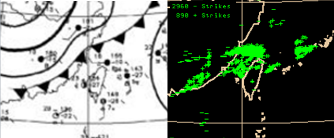 圖::昨(22)日14時地面圖(左圖)顯示,鋒面在北部海面向西延伸至福建。22日16:40落雷偵測系統觀測的日累積落雷分布(右圖)及落雷數(右圖左上角),顯示對流相當活躍,而位置大都在地面鋒之前相當遠的範圍,及一部分在鋒面附近、鋒後就很少。 |