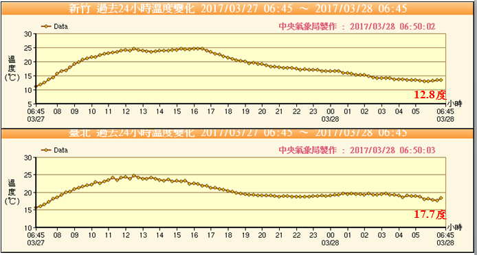 溫暖舒適至週五 週五下午變天吳德榮2017/03/28 冷空氣減弱、天氣持續回暖中;今(28日)晨各地天空晴朗,新竹風力微弱,「輻射冷卻」效應強,截至6:45的溫度變化圖(上圖)顯示,氣溫入夜後逐漸下降,清晨5:49降至最低12.8度。台北因風力較強,造成空氣混合,破瓌「輻射冷卻」效應,入夜後氣溫下降不明顯(下圖)。兩地的溫差達到5度(台北市低溫17.7度)之多。可見「輻射冷卻」效應的不同,會給各地帶來差異甚大的最低氣溫,甚至於僅是相鄰的地區(板橋低溫13.5度)。