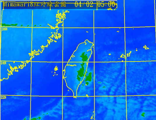 昨(1)日是清明假期第1天,僅上午前有雨,下午已見陽光,白天氣溫略升;昨晚至今(2日)晨,冷空氣再加上「輻射冷卻」效應,逐漸降溫。今晨截至5:30的最低氣溫:板橋9.8度、嘉義10.0度、基隆10.5度、淡水、宜蘭11.1度(符合模式模擬,中部以北最低溫降至10、11度左右);台北市也降至11.6度(符合模式模擬,都會區最低溫降至12度左右),已達到「強烈大陸冷氣團」的強度,由於秉性乾冷,感受上比較沒那麼寒冷。今晨5時紅外線衛星雲圖(圖)顯示,受到高壓籠罩,台灣附近晴朗無雲,僅花東交界外海有一些層狀雲。