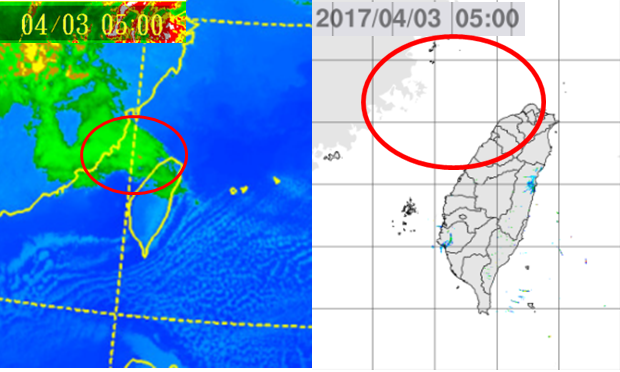 右圖:今晨5時雷達回波合成圖顯示,華南移向北台灣的雲層,無降水回波(紅圈)是不下雨的,只會使雲量稍增。