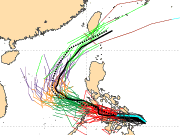 最新(14日20時)歐洲中期預報中心(ECMWF)模式模擬的路徑(圖),今、明(15、16日)兩天「熱帶低氣壓」將通過菲律賓中部,下週一(17日)進入南海,逐漸轉北再轉向東北,下週三(19日)進入巴士海峽、繼續向東北東前進(黑實線)。歐洲最新系集預報模式亦顯示其「不確定性」,50次的模擬路徑(圖)大部分離台灣較遠,僅有部分距離相當近,也反映影響機率的高低。台灣部分地區的天氣是否受到影響?或者完全無影響?機率都存在,目前還很難說!另外的問題就是「熱帯性低壓」是否會發展成「輕颱」?目前模式模擬的條件,海水熱含量(OHC)夠暖、是有利發展的;但其路徑附近的環境垂直風切偏大、且今明兩天開始有菲律賓中部地形的破壞,則都是不利的因素;模式模擬並不認為它會有明顯的發展。但即使如此,我們使用電腦模式資料,一定要瞭解其對於強度的模擬,相較於路徑的模擬,能力更是不足,所以都需要持續觀察。