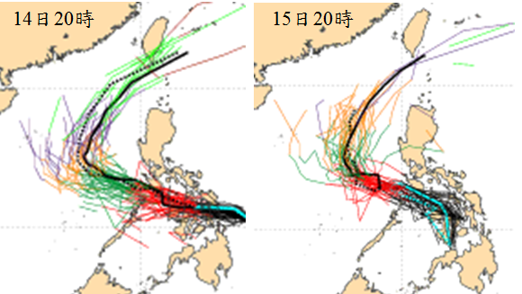 圖:最新(15日20時)歐洲中期預報中心(ECMWF)模式(右圖)與前一天(14日20時)的模擬(左圖) 類似,「熱帶低氣壓」今(16)日將通過菲律賓中部,明(17)日進入南海,逐漸轉北,週三(19日) 再轉向東北,週四(20日)進入巴士海峽、繼續向東北東前進(黑實線)。新的系集預報50次的模擬路徑(右圖),大部分離台灣較遠,有很多中途消失,能接近台灣的僅是少數,反映影響台灣的機率又調整得更低了。 |