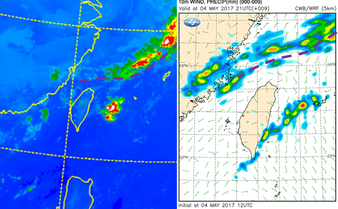 今明微弱鋒面 局部短暫降雨 北台舒適偏暖吳德榮2017/05/05 今(5日)晨5時紅外線衛星雲圖(左圖)顯示,鋒面雲系從日本南方海面向西南延伸至北部海面,鋒面尾段的雲系、結構鬆散,至5時止各地未下雨、也未降溫。中央氣象局細網格模式(WRF 5公里)模擬今晨5時地面圖(右圖),微弱鋒面已南下至北部海面,結構鬆散,降雨零星、大都還在海上,與雲圖配置相當穩合。
