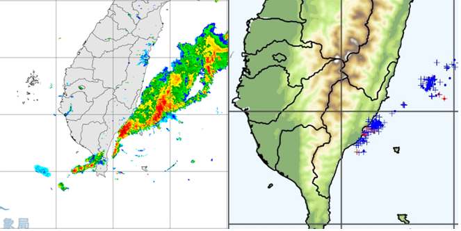 左圖:今(6日)晨1:30雷達回波合成圖顯示,帶狀的強回波在東部海面,尾端接台東。 右圖:今(6日)晨1:30閃電偵測顯示1小時內之雷擊數,台東陸地、沿海一帶有一區密集的雷擊。 |