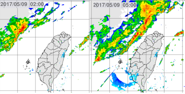 微弱鋒面影響 北台高溫略降 南部悶熱吳德榮2017/05/09 今(9日)晨2時(左圖)及5時(右圖)雷達回波合成圖顯示,微弱鋒面附近的帶狀回波,由西向東前進、時速超過60公里,若以最原始的外延法推估大約清晨6、7點,已抵達台灣。其對流強度雖然正逐漸減弱,但在其影響期間(抵達後1、2個小時內),仍有可能會激發一些新生成的對流胞,而帶來局部性雷雨的機率。