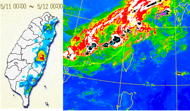 左圖:昨(11)日累積雨量圖顯示,午後雷陣雨,從北、東部山區發展逐步向平地擴展。
