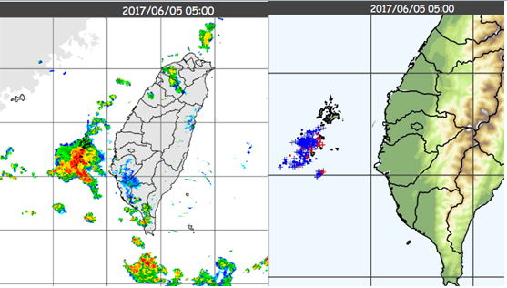 仍有局部短暫陣雨 應避免山區活動吳德榮2017/06/05 今(5日)晨西南氣流已大幅減弱,5時雷達回波合成圖(左圖)顯示,高屏山區迎風面產生的降水回波已不復存在;滯留鋒雖仍在台灣附近,能激發的對流已明顯減少,本島僅在桃竹及屏東一帶有移動性降水回波,另外在澎湖附近有比較活躍的對流,伴隨密集的閃電(右圖)。整體而言,天氣較前幾天已緩和許多。