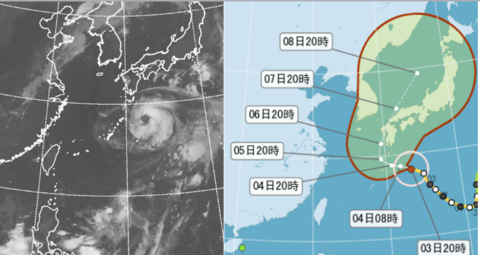 左圖:今(4)日2時紅外線雲圖顯示,「諾盧」颱風,強度略減弱,仍是中度颱風,持續呈現「大眼颱」的結構。 右圖:3日20時「路徑潛勢預測圖」顯示,週日至下週一(6至7日)侵襲日本九州、四國及本州西部時,因已通過琉球附近高海洋熱含量(OHC)的海域,應是比較強的中度颱風,下週二(8日)進入日本海,強度減弱。 |