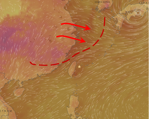 圖:歐洲中期預報中心(ECMWF)模式模擬7日8時,925百帕溫度場及風場顯示,大陸暖而乾近地(混合)層大氣(紅虛線為其邊界)順著西風平流入太平洋,包括北部海面;暖平流及太陽輻射提供高溫的基本條件。(圖取自windy) |