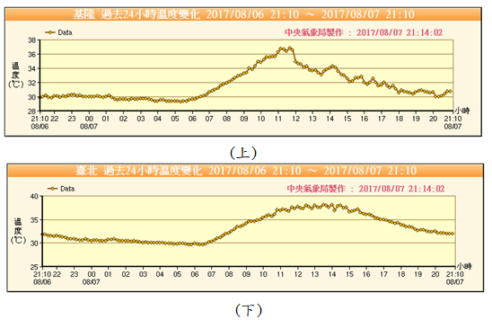 上圖:7日21:10基隆24小時溫度變化圖顯示,正午12時前後溫度最高,之後逐漸下降。 下圖:7日21:10台北24小時溫度變化圖顯示,下午14時前後溫度升至最高,之後才緩慢下降。 |