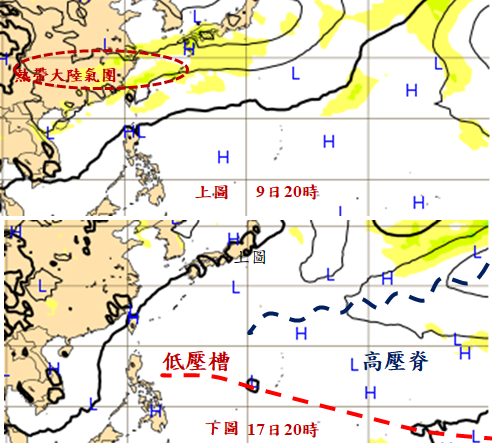 上圖:最新(8日20時)歐洲中期預報中心(ECMWF)模式模擬,今(9)日)20時地面預測圖及850百帕風場顯示,乾暖的低層大氣(熱帶大陸氣團)由陸地吹向海洋。 下圖:17日20時熱帶大陸氣團北退,熱帶海洋氣團取代,大平洋高壓北移(藍虛曲線)。太平洋高壓南側,形成有利「熱帶擾動」發展的環境(低壓槽)。