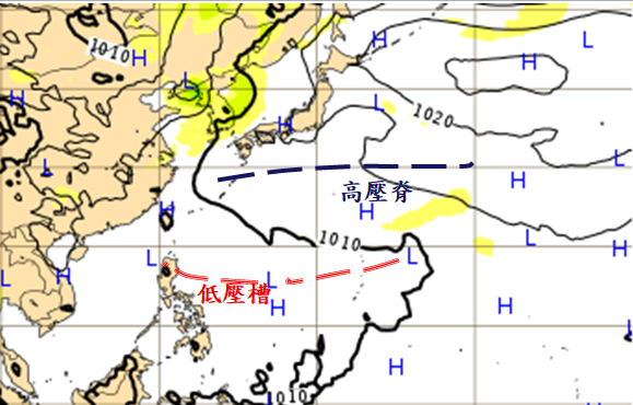 圖:最新(12日20時)歐洲中期預報中心(ECMWF)模式模擬,21日20時地面圖顯示,太平洋高壓脊(藍虛線)已北移至日本南方海面,遙指台灣北部海面。太平洋高壓南側菲律賓東方為低壓區,利於「熱帶擾動」發展,值得進一步觀察。 |