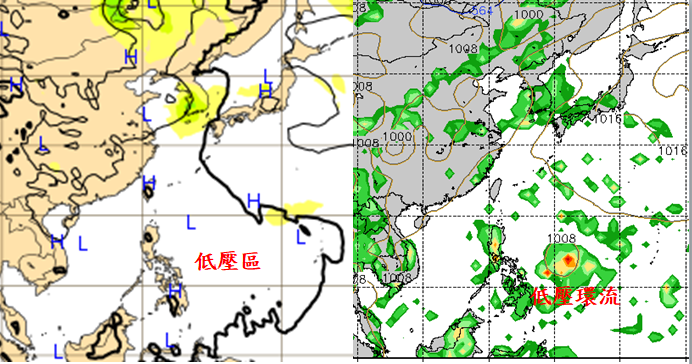 圖:最新(14日20時)模式模擬,21日20時歐洲模式(ECMWF)模擬,菲律賓東方海面是低壓區,尚無明顯的低壓發展(左圖);美國模式(GFS)則已有低壓環流產生(右圖)。 |