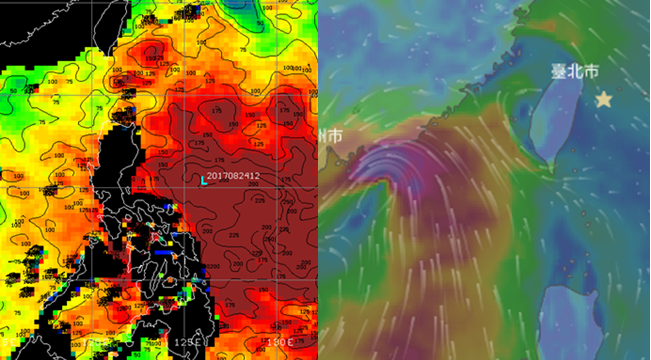 左圖:今(25日)晨2時「帕卡」已經成形,朝呂宋島接近,經過海水熱含量(OHC)高的海域,有利繼續增強。(OHC資料來源RSMAS) 右圖:24日20歐洲模式模擬,27日8時850百帕風場圖顯示,其未來路徑,向西北西;在香港外海的逆時鐘環流,即為其預測位置。 (圖擷取自Windy) |