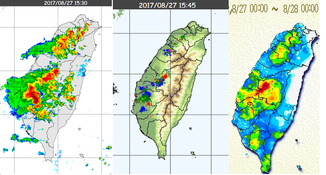 圖:昨(27日)「帕卡」外圍雲系造成台東及恒春半島有較明顯的降雨(右圖)。午後對流發展旺盛(左圖),伴隨密集的閃電(中圖),西半部有局部大雨或豪雨,南投集集超過200毫米為最多(右圖)。 |