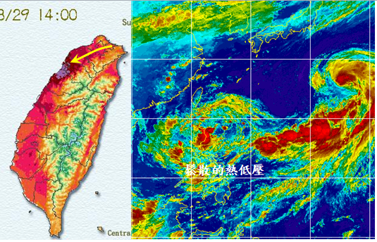 左圖:昨(29)日14:00溫度分布圖顯示,盛行東北東風(黃箭),氣塊自東北沿岸經台北、新北、桃圍至新竹,從地表吸熱、增溫(紅色漸深),至新竹時達最高溫(紫色)。 右圖:今(30)日4時紅外線衛星雲圖顯示,低氣壓在菲律賓東方海面,向西移動,結構仍然鬆散。 |