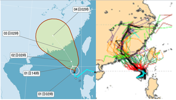 左圖:氣象局1日2時的「路徑潛勢預測圖」顯示,路徑大致朝向北北西前進;週(3)日清晨則登陸廣東一帶。但其右側的「不確定性」(70%)範圍,離台灣也不遠。 右圖:31日20時歐洲中期預報中心(ECMWF)系集模式,51次的模擬,路徑大多朝向北北西前進,於週(3)日登陸廣東一帶,顯示機率比較高;但仍有部分的路徑對台灣是有威脅的。 |