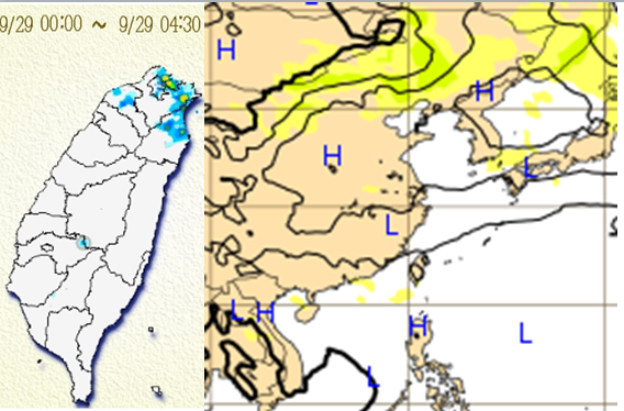 左圖:今(29日)晨4:30雨量圖顯示桃園以北仍有局部雨,北海岸雨較多。 右圖:28日20時歐洲中期預報中心(ECMWF)模式,模擬中秋夜(4日20時)顯示,適逢東北季風,迎風面雲較多,北台灣沿海及山區有局部降雨的機率;背風面則天氣穩定。 |