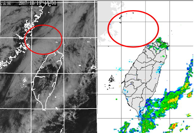 左圖: 中央氣象局昨(19)日14時可見光雲圖顯示,在海面上有穩定的低層雲(紅圈)。 右圖:紅圈內低層雲由於水滴太小、或雲層太低,雷達偵測在海上無回波;在北部陸地的層狀雲受地形抬升,則有弱回波生成,也帶來降雨。 |