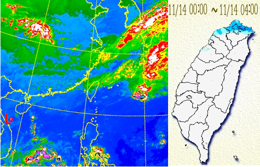 今北台偏涼局部短暫雨 中南部多雲時晴吳德榮2017/11/14 《本專欄轉載自「三立準氣象·老大洩天機」,引用請註明》 「海葵」於前(12)日14時已在減弱為熱帶性低氣壓,其殘餘的中層雲系,不斷順著中層大氣的導引,通過台灣附近,今(14日)晨4時紅外線衛星雲圖(左圖)顯示中層雲大部分已通過並逐漸消散,今晨只為北台灣帶來降雨(右圖)。