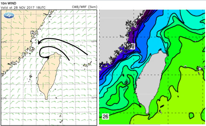 今新竹以北轉濕冷 中部氣溫略降吳德榮2017/11/30 《本專欄轉載自「三立準氣象·老大洩天機」,引用請註明》 昨(29)日上半天馬祖被「平流霧」籠罩,原因是偏東(左圖)的暖溼空氣,流向低海溫(右圖)的大陸沿岸,凝結成霧,順著東北風影響馬祖。部分被北部海面氣旋式環流的西風(左圖)帶向淡水河口,並形成雲霧遮蔽淡水河口的美景。昨晨嘉義亦有霧的形成,原因是地表長波輻射,冷卻空氣、造成水氣的凝結,是為「輻射霧」。這兩個現象也宣告台灣將進入比較多霧的季節。這波東北風的前緣,昨晚21時通過彭佳嶼,今(30日)晨已達北台灣,氣溫逐漸下降、並給北海岸、北部山區帶來明顯降雨(截至5時瑞芳已超過50毫米),北部的空汙已因東北風增強而消散,中部也已有改善。