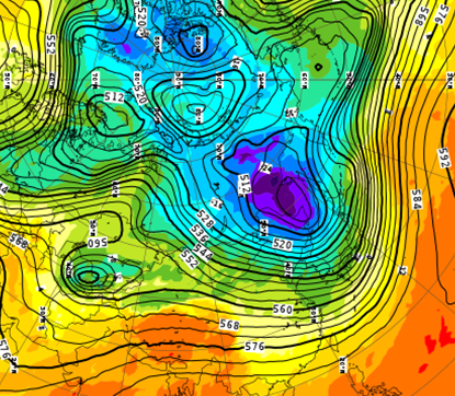 圖:最新(2日20時)歐洲中期預報中心(ECMWF)模式模擬500百帕5日20時高空圖顯示,北半球最冷的空氣(深藍色)偏向亞洲(東半球),低層冷空氣隨著高空氣流南下,週期約3至4天,行至華中就轉向東海、再轉往日本。