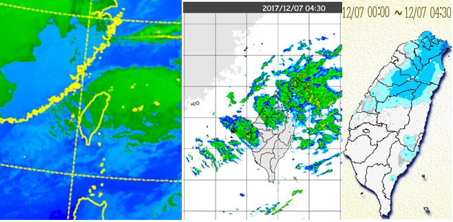 今(7日)晨4:30紅外線衛量雲圖(左圖)顯示,台灣上空有很多海峽移入的中層雲。同時的雷達回波合成圖(中圖)顯示迎風面有較強的回波、亦有從海峽移入的弱回波。同時的累積兩量圖(右圖)顯示北台灣、中部山區降雨明顯、中部平地也有降雨,其他地區有局部、零星飄小雨的現象。今晨截至5時的最低溫,梧悽15.3度、淡水15.6度、新屋15.8度,冷空氣已較昨(6日)晨減弱;且輻射冷卻效應很小,故昨晨發生在嘉義的最低氣溫,已不復出現。
