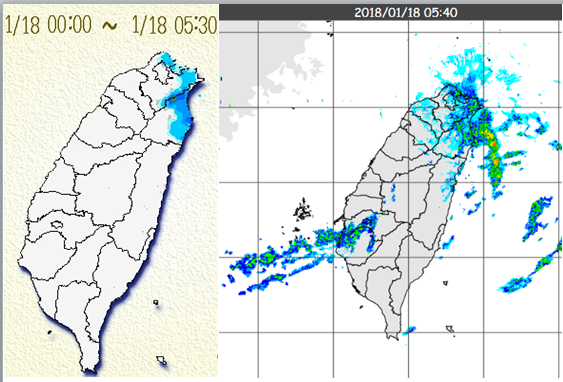 今起北台轉濕涼 下週另有兩波東北季風吳德榮2018/1/18 《本專欄轉載自「三立準氣象·老大洩天機」,引用請註明》今(18日)晨5:30雨量圖顯示,東北季風開始為東北部及北海岸帶來降雨(左圖),5:40雷達回波合成圖顯示,南海北移的水氣正逐漸增多(右圖);由於雲量增多,少了輻射冷卻效應,截至5:30平地最低氣溫:新屋17.8度、嘉義18.1度,大致與昨日相近,並未因東北季風而下降。