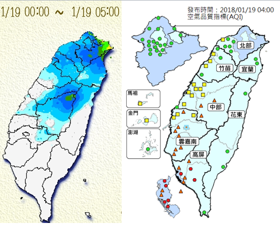 東北季風受到中央山脈阻擋,背風面中南部風力微弱,本土的空汙又開始累積。今(19日)晨4時空氣品質監測資料(右圖)顯示,中南部為橘色警示,尤其高屏更達紅色警示。「環保署」預報最近3天狀況都是類似的,民眾出門活動最好要隨時注意監測資料,瞭解戶外的空氣品質,妥善採取因應措施。 左圖:今(19日)5時雨量累積圖顯示,南方雲系移入帶來大範圍降雨,東北季風則為東北部及北海岸帶來較明顯降雨。 右圖:今(19日)晨4時空氣品質監測資料(右圖)顯示,東北季風受到中央山脈阻擋,背風面中南部風力微弱,空氣品質為橘色警示,尤其高屏更達紅色警示。 |